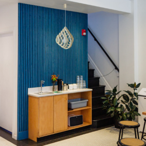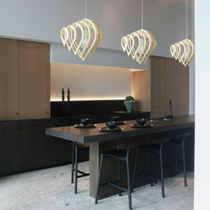 Oryginalna, lampa wisząca w formie cylindra z różną długością lameli.