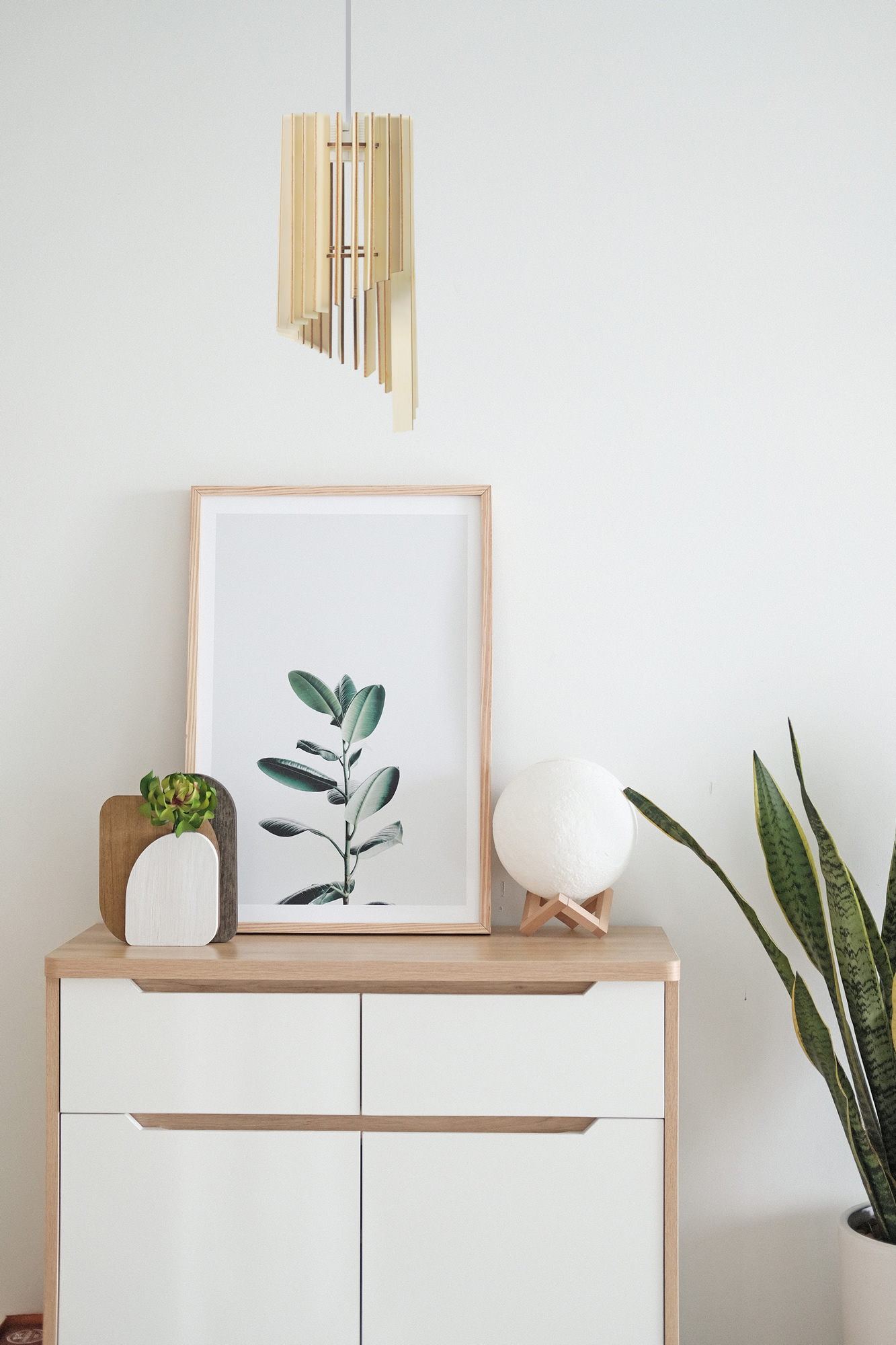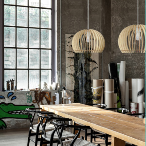 Lampa jest wykonana ze sklejki, polakierowana nietoksycznym lakierem wodnym o odcieniu pół-mat.