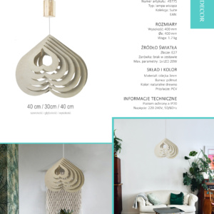Lampa jest wykonana ze sklejki, polakierowana nietoksycznym lakierem wodnym o odcieniu pół-mat.